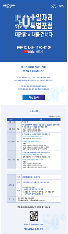[로컬세계 이명호 기자]서울시50플러스재단은 코로나19로 가속화하는 디지털·그린 사회로의 대전환 시대를 맞아 50+세대의 일자리 안정성과 미래 삶의 방향 설계를 논의하기 위해 12월 1일 ‘50+일자리 특별 포럼’을 개최한다.