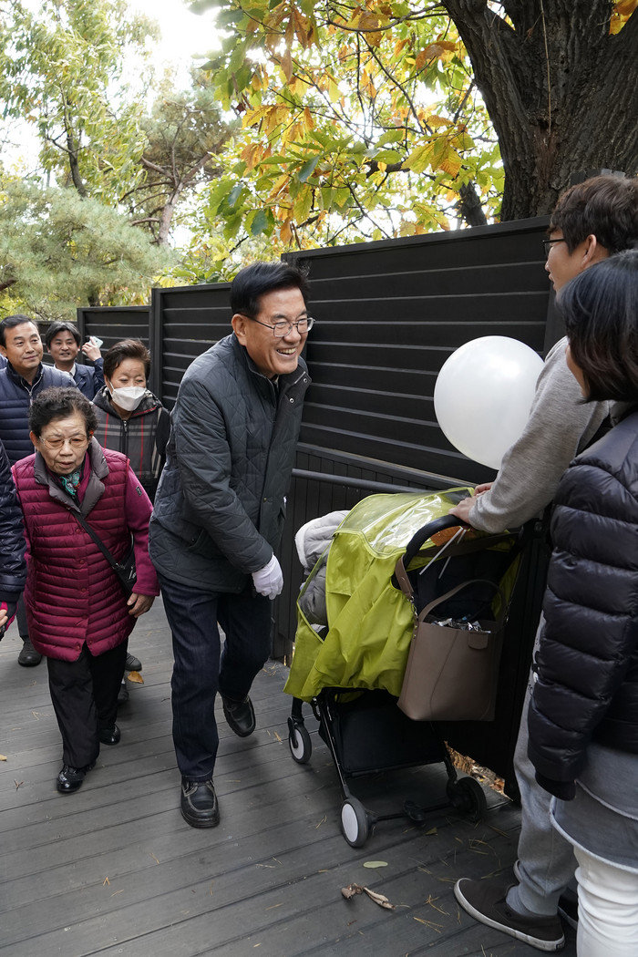 ▲27일 배봉산 둘레길 개통 기념 걷기행사에 참석한 유덕열 동대문구청장이 유모차를 끌고 나온 주민들에게 인사하고 있다. |