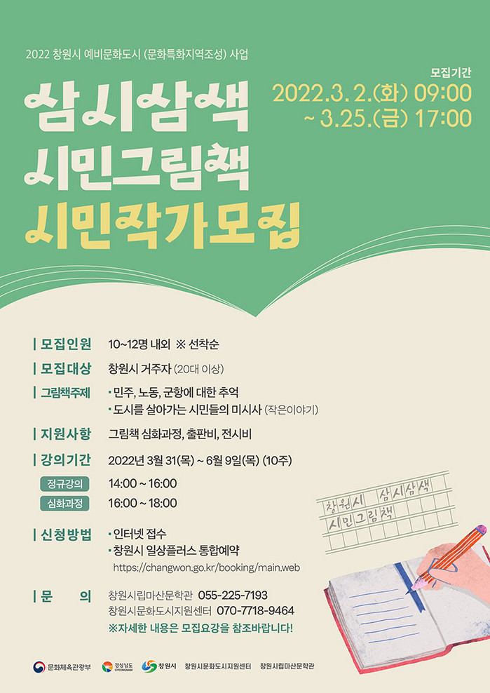 [로컬세계 한용대 기자]경남 창원시(시장 허성무)와 창원시문화도시지원센터는 오는 25일까지 ‘삼시삼색 시민그림책 프로젝트’를 통해 그림책 제작에 참여할 시민작가를 모집한다.