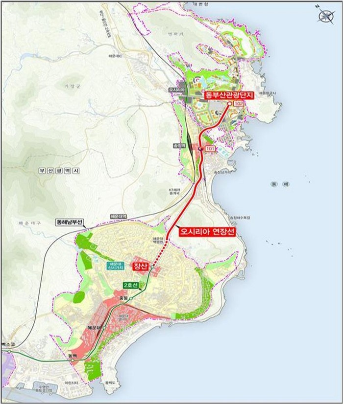 신규사업에 포함된 오시리아선은 도시철도 2호선을 좌동 장산역에서 오시리아 관광단지까지의 4.13㎞를 연장하는 것이다.