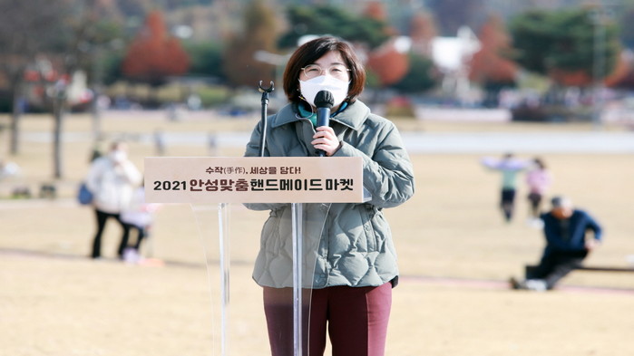 | ▲김보라 시장이 ‘2021 안성맞춤 핸드메이드 마켓’ 개막식에서 인사말을 하고 있다. 안성시 제공 |