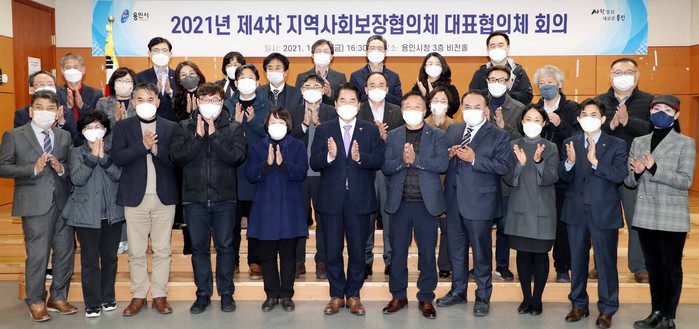 | ▲백군기 시장이 2021년 제4차 지역사회보장협의체 대표협의체 회의 후 관계자들과 기념촬영을 하고 있다. 용인시 제공 |