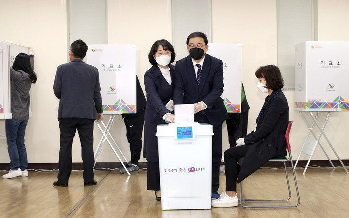 | ▲허성무 창원시장이 10일 오전 8시 성산구 상남동사전투표소에서 소중한 한 표를 행사하고 있다.(창원시 제공) |