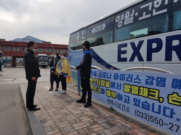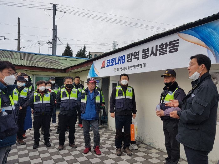 류태호 태백시장이 7일 오전 코로나19 예방을 위해 방역활동에 전념하고 있는 태백시자율방범연합대 봉사대원 및 비상근무를 하고 있는 공무원들을 찾아 격려했다.(사진=태백시 제공)