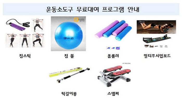 대여하는 운동소도구는 짐스틱, 짐볼, 폼롤러, 멀티푸시업보드, 턱걸이봉, 스텝퍼 등이며, 네이버밴드를 통한 건강정보(운동영상, 영양식단)제공 및 인증 이벤트 실시, 사전·사후 체성분 검사와 설문조사, 대여 만료 후 개인목표 달성 시 선물 지급 등으로 참여자의 신체활동량을 늘려 건강행태 개선을 유도할 예정이다.
