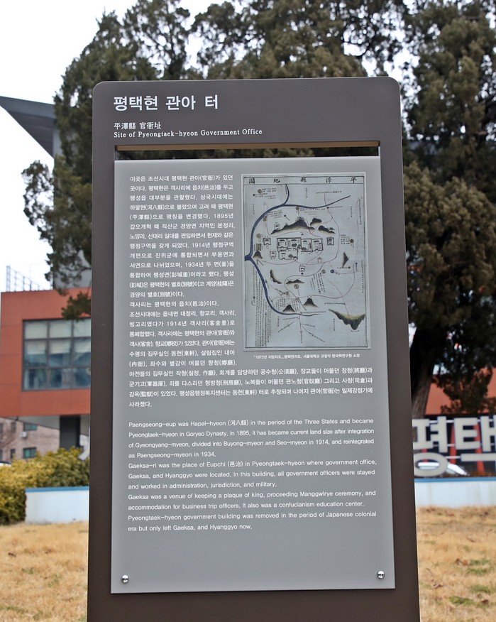 이번에 설치된 표지석은 화강암 재질로 조선시대 평택현의 관아터임을 알리는 표지석과 역사적 의미를 설명하는 안내판으로 구성됐다. 평택현의 고지도와 함께 영문설명도 덧붙여 시민은 물론 미군 등 외국인들이 쉽게 이해할 수 있도록 했다.