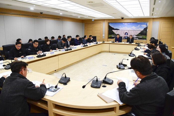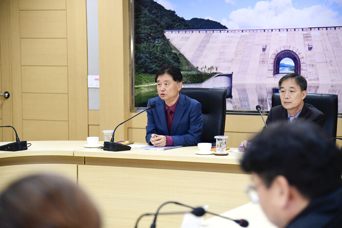 최문순 군수가 2024년 화천군 정부 예산확보 추진계획 보고회에서 인사말을 하고 있다. 2024년 화천군 정부 예산확보 추진계획 보고회가 8일 군청에서 최문순 군수, 지기선 부군수를 비롯해 각 실과소장과 담당 공무원들이 참석한 가운데 열렸다. (사진=화천군 제공)