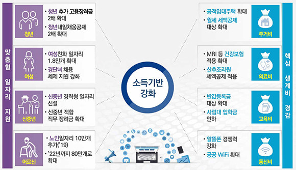 아동수당 대상은 만 7세 미만 취학전 아동으로 확대하고, 기초연금은 소득하위 20% 대상으로 내년 4월부터 25만원에서 30만원으로 인상 지원한다. 한국형 실업부조는 2020년에 본격 실행될 수 있도록 기반을 구축할 계획이다.