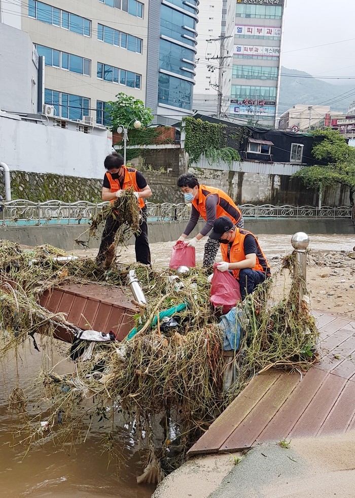 이에 따라 금정소방서 의용소방대에서는 온천천 범람으로 주변에 토사와 쓰레기가 많이 떠내려온 온천천 일대를 4인 1조로 20여 명이 함께 주변 쓰레기와 토사물 등을 처리하는 정화활동을 벌였다.