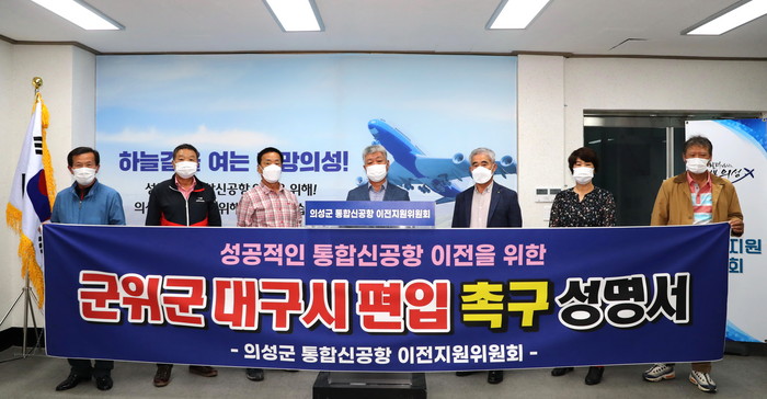[로컬세계 박상진 기자]경북 의성군 통합신공항 이전지원 위원회(위원장 이광휘)가 29일 군위군 대구시 편입 촉구 성명서를 발표했다.
