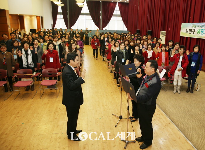 ▲이동진 도봉구청장(왼쪽)이 생명지킴이 발대식에서 선서를 받고 있다. ©로컬세계 |