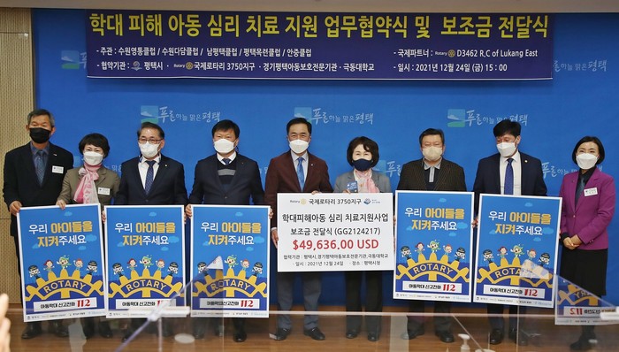 정장선 시장은 “학대 피해 아동을 위해 후원을 약속해주신 국제로타리3750지구 회원들에게 감사드린다”며 “학대 피해 아동 심리치료 사업을 차질 없이 추진해 아동이 행복한 평택시를 만들 수 있도록 노력하겠다”고 말했다.