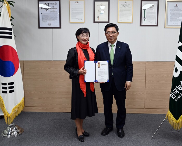 ▲ 감사장 전달식 현장 사진. 한국농수산식품유통공사 김춘진 사장(우측), 장정은 한영문화교류재단 이사(좌측). 한국농수산식품유통공사 제공 |