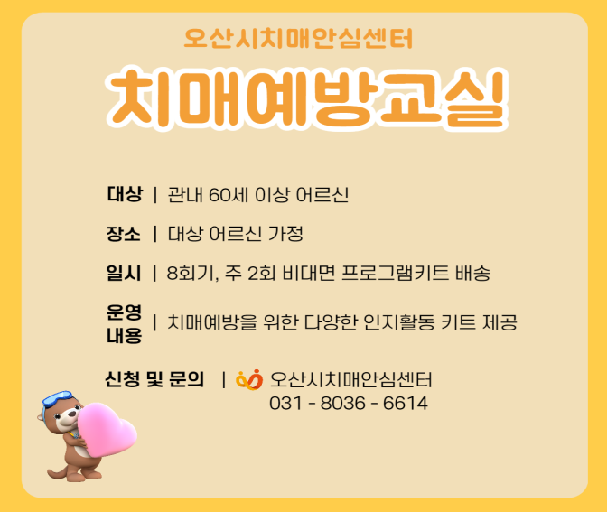 치매 검진 및 관리 지원에 대해 궁금한 사항은 오산시 치매안심센터 혹은 치매안심콜센터로 문의하면 된다.