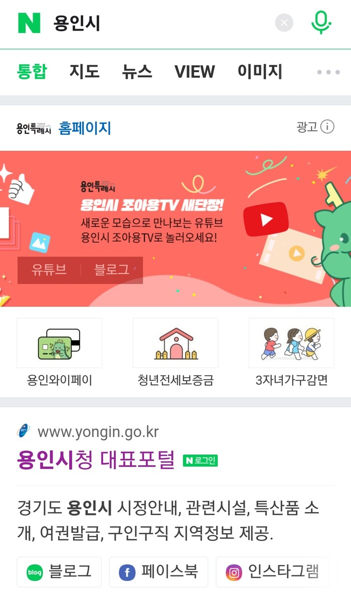 | ▲ 네이버에서 용인시를 검색할 때 용인청년 전세보증금 반환보증 보증료 지원 신청 페이지가 나오고 있다. |
