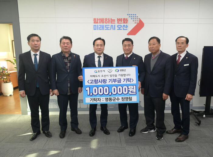 [로컬세계=김병민 기자]경기 오산시는 2일 자매도시인 충북 영동군 정영철 군수, 영동군의회 김오봉 산업경제위원장과 신현광 의원이 방문해 고향사랑 기부금 총 200만원을 기탁했다고 밝혔다.