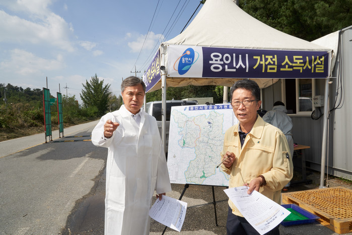 ▲이건한 의장이 아프리카돼지열병 유입 차단을 위해 처인구 백암면에 설치된 거점소독시설인 백암1초소 현장을 방문해 방역 진행상황을 점검하고 있다.(용인시의회 제공) |