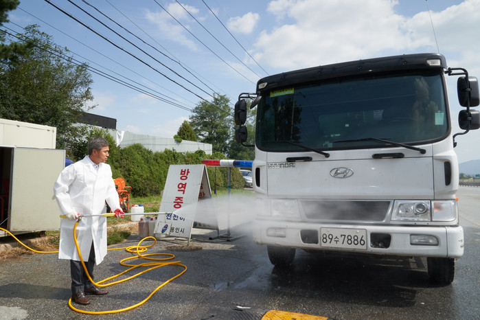 [로컬세계 고기훈 기자]경기 용인시의회 이건한 의장은 19일 오후 1시 30분 아프리카 돼지열병 유입 차단을 위해 처인구 백암면에 설치된 거점소독시설인 백암1초소 현장을 방문했다.