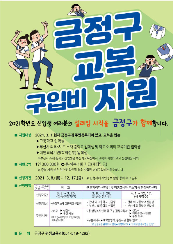 금정구는 관내 청소년 중 오는 3월 1일 기준으로 금정구에 주민등록이 되어 있는 올해 고등학교 입학생 또는 타 시‧도 소재 중학교 입학생, 대안교육기관 입학생 약 1666명을 대상으로 교복구입비를 지원한다. 인당 30만원까지 개별 계좌에 입금하는 방식이다. 부산시교육청에서 교복구입비를 지원받는 시 소재 중학교 입학생들은 지원대상에서 제외된다.