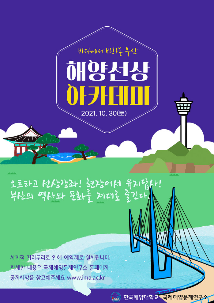 [로컬세계 맹화찬 기자]한국해양대학교 국제해양문제연구소(소장 정문수)는 ‘제21회 해양선상아카데미’를 오는 30일 오전 10시 부산 수영만 요트경기장에서 개최한다고 밝혔다.