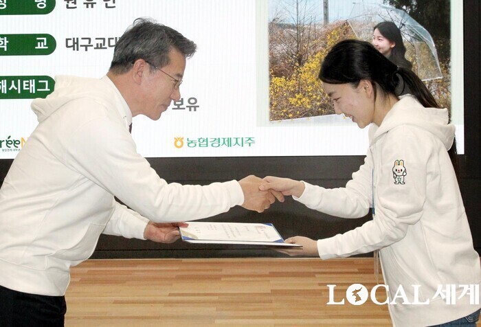 농협경제지주(농업경제대표이사 박서홍)가 12일 서울시 중구 농협중앙회 본관에서 농업경제 대학생 홍보단 ‘greeNy(그리니)’ 1기 발대식을 개최했다. 박서홍 농협경제지주 농업경제대표이사(왼쪽)가 홍보단 임명장 수여를 하고 있다.