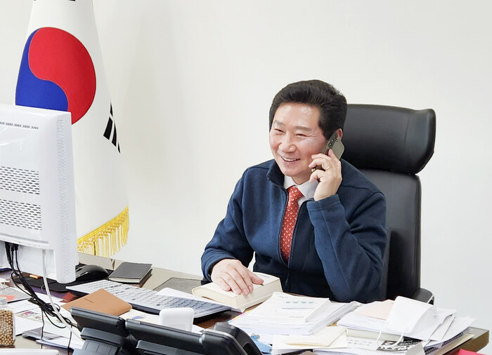 ▲ 이상일 용인특례시장이 2일 우상혁 선수와 전화로 새해 인사를 나누고 있다. |