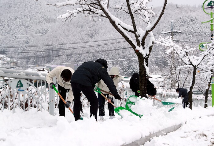 시는 15일 오후부터 많은 눈이 내려 시민들의 통행이 어려워지자 눈길 낙상사고를 예방하기 위해 인력 제설이 필요한 보도 및 이면 도로에 시청 전 직원을 동원해 제설작업을 펼쳤다.