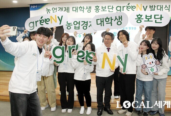 박서홍(앞줄 왼쪽네번째) 농협경제지주 농업경제대표이사가 12일 오후 서울 중구 농협 본관에서 열린 농업경제 대학생 홍보단 ‘greeNy’ 발대식에서 대학생들과 셀카를 찍고 있다. 농협경제지주는 이날 서울시 중구 농협중앙회 본관에서 농업경제 대학생 홍보단 ‘greeNy(그리니)’ 1기 발대식을 개최했다.