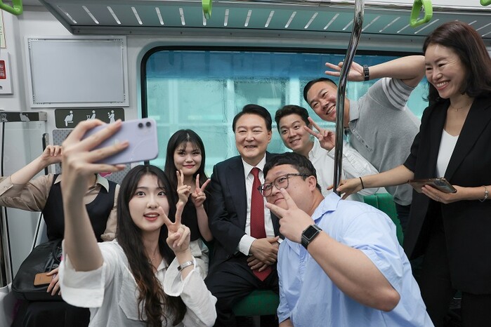 ▲ 윤석열 대통령이 30일 대곡-소사 복선전철 개통 기념식에 앞서 경기도 부천 원종역에서 고양 대곡역을 향하는 전철에서 함께 시승한 주민들과 기념촬영하고 있다.(대통령실 제공) |