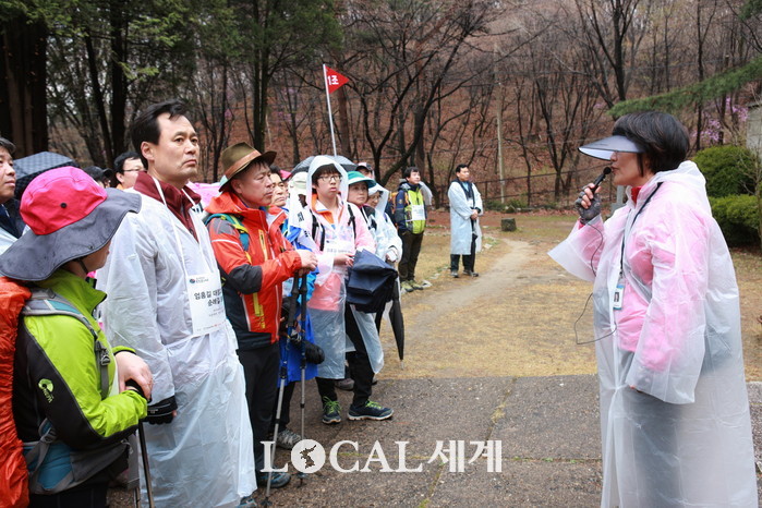 ▲ 박겸수 강북구청장(왼쪽에서 2번째)과 구민들이 문화탐방 프로그램에 참여한 가운데 해설가로 부터 지역 역사이야기를 전해듣고 있다. © 로컬세계 |