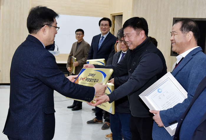 | ▲허종식 균형발전정무부시장이 4일 시청 대회의실에서 열린 '2018 모범직업소개소 인증서 수여식'에서 모범직업소개소에 선정된 업체에 인증서와 현판을 전달하고 있다. |