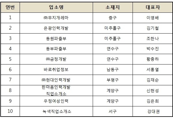 모범직업소개소는 취업 지원실적과 지역사회기여도 및 안정적인 취업환경 등의 항목을 기준으로 각 군·구의 추천을 받아 인천시 선정위원회에서 최종 선정한다.
