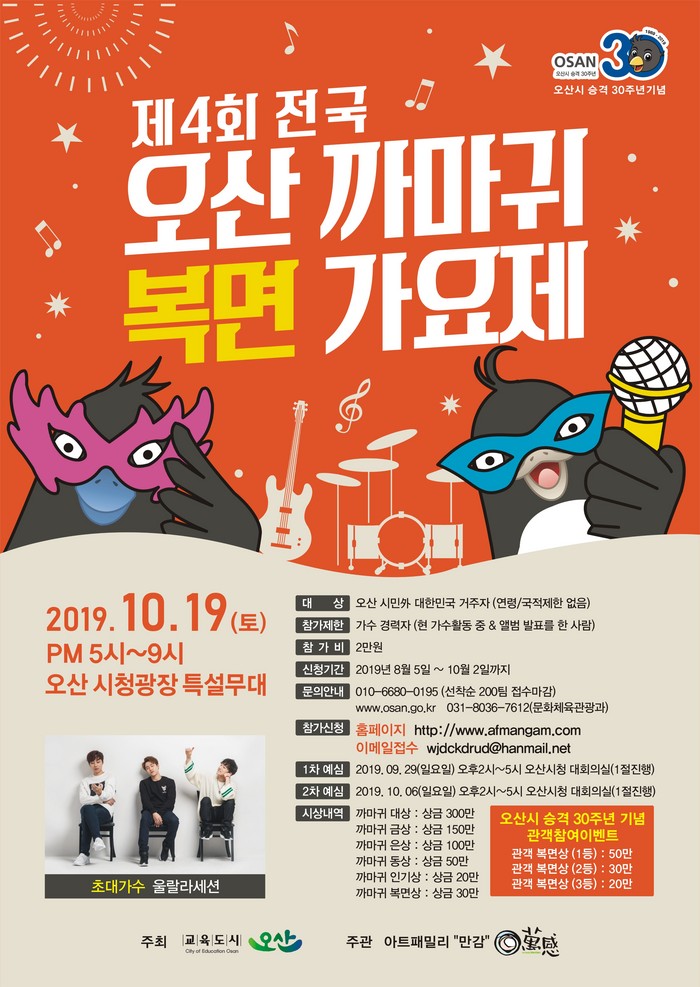 이번 오산 까마귀 복면 가요제의 참가신청 접수는 아트패밀리 만감 홈페이지(www.afmangam.com)에서 진행된다.