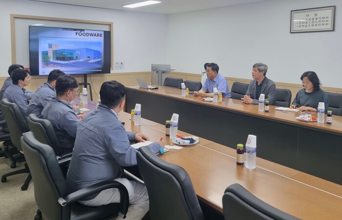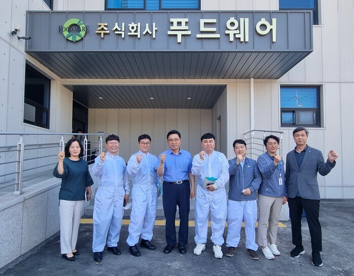 ▲ ㈜푸드웨어 방문 수출 확대 현장 간담회 기념사진. 한국농수산식품유통공사 김춘진 사장(좌측 4번째), ㈜푸드웨어 양재기 생산본부장(좌측 2번째) / aT 제공 |