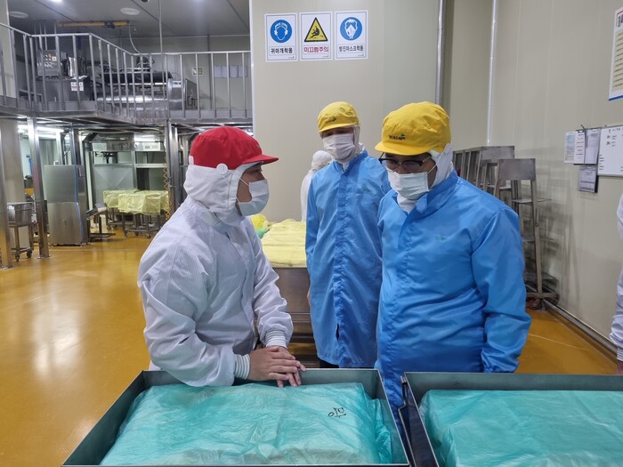 한국농수산식품유통공사 김춘진 사장은 16일 전북 김제시 소재 ㈜푸드웨어(대표 신동식)를 찾아 고품질 만두 생산시설과 제조과정을 점검한 뒤 현장 애로사항을 청취하고 지속 가능한 수출 확대 방안을 논의했다.