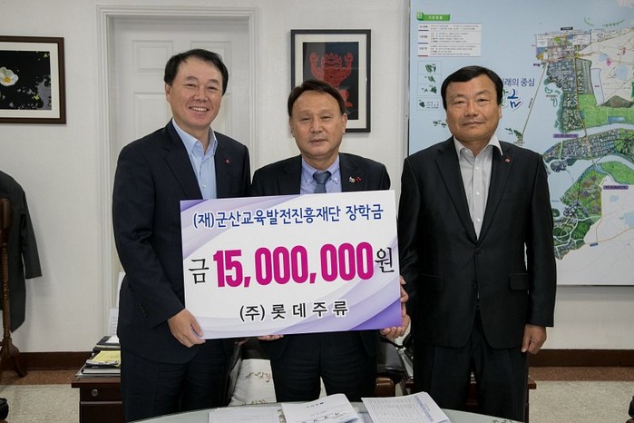 ▲롯데주류는 군산시 교육발전을 위해 써달라며 장학금 1500만원을 기탁했다.(군산시 제공) |
