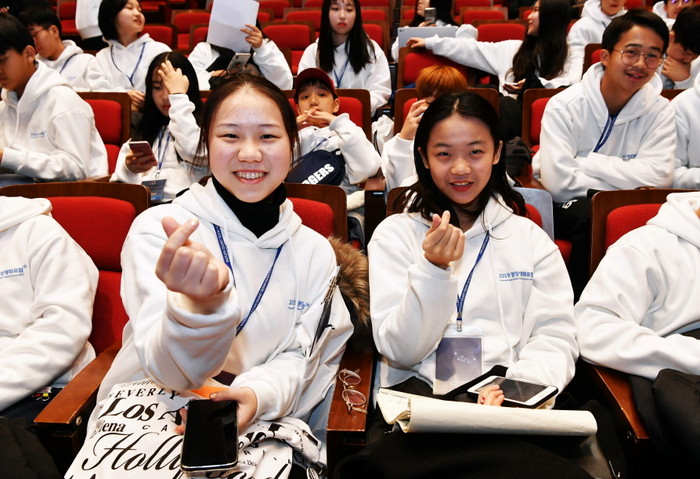 ▲2019 청소년 모의유엔대회 참가 청소년들의 손하트 포즈로 인사를 하는 모습.(사진=강원도 제공) |
