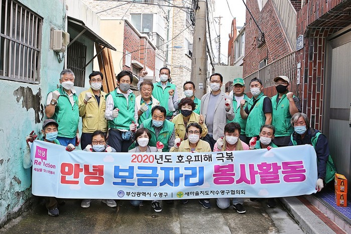 [로컬세계 맹화찬 기자]부산 수영구(구청장 강성태)는 지난 12일 수영구 새마을 뚝딱이 봉사단(회장 정종무)으로 구성된 회원 20여 명과 함께 지난 태풍으로 많은 피해가 발생한 취약계층을 대상으로 도배 및 지붕교체 등 수리복구 봉사활동으로 다함께 행복한 동네를 만들기 위한 안녕 보금자리 활동 행사를 가졌다.(사진=부산 수영구 제공)