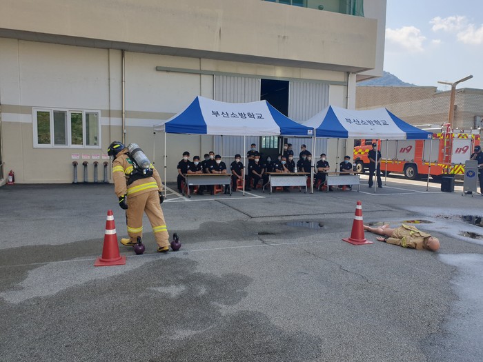 부산소방학교는 학교 실정에 맞는 체력코스를 설계하여, 교관들은 방화복 및 공기 호흡기 세트를 착용 한 후 체력향상(전문체력측정) 프로그램 시연회를 개최했다.