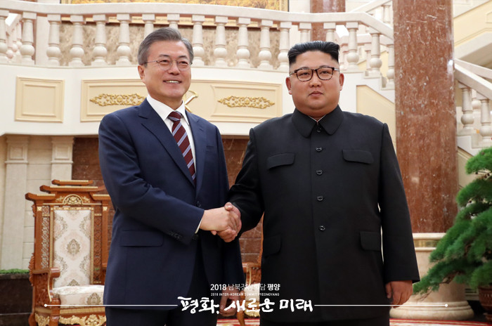 ▲문재인 대통령이 18일 오후 평양 조선노동당 중앙위원회 본부 청사 로비에서 김정은 국무위원장과 정상회담 시작 전 악수를 나누고 있다.(사진= 평양사진공동취재단) |