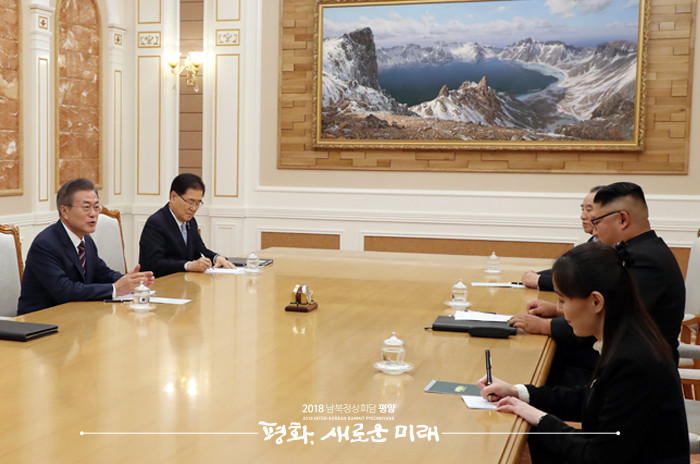 ▲문재인 대통령이 18일 오후 평양 조선노동당 중앙위원회 본부 청사에서 김정은 국무위원장과 정상회담을 하고 있다.(사진= 평양사진공동취재단) |
