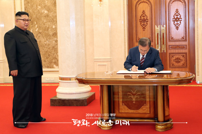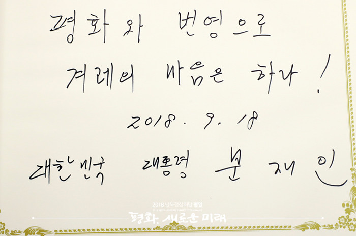 ▲문재인 대통령이 18일 오후 평양 조선노동당 중앙위원회 본부 청사를 방문해 김정은 국무위원장과 정상회담에 앞서 남긴 방명록. (사진=평양사진공동취재단) |