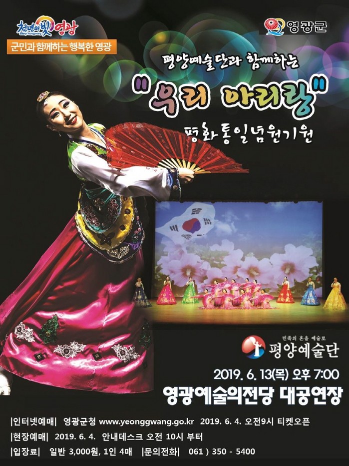 관람료는 전석 3000원이며 입장권은 오는 6월 4일부터 티켓링크를 통해 인터넷 예매가 가능하고 영광예술의전당 안내데스크에서 현장예매를 실시한다.