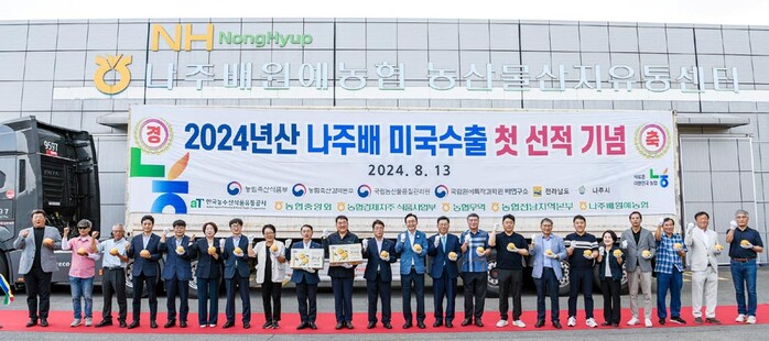 한국농수산식품유통공사 김춘진 사장은 13일 나주배원예농협 산지유통센터(조합장 이동희)를 찾아 2024년산 나주 햇배 미국 첫 수출 선적식에 참석했다.