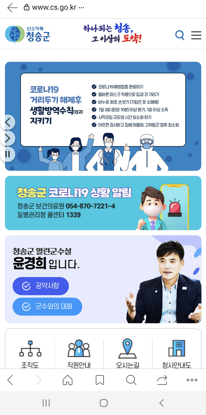 [로컬세계 = 이창재 기자]경북 청송군은 스마트폰을 통하여 인터넷을 사용하는 기회가 많은 점을 고려해 모바일 서비스 중심의 군청 홈페이지 메인화면 디자인을 개편하고 지난달 31일부터 새롭게 서비스를 개시했다.