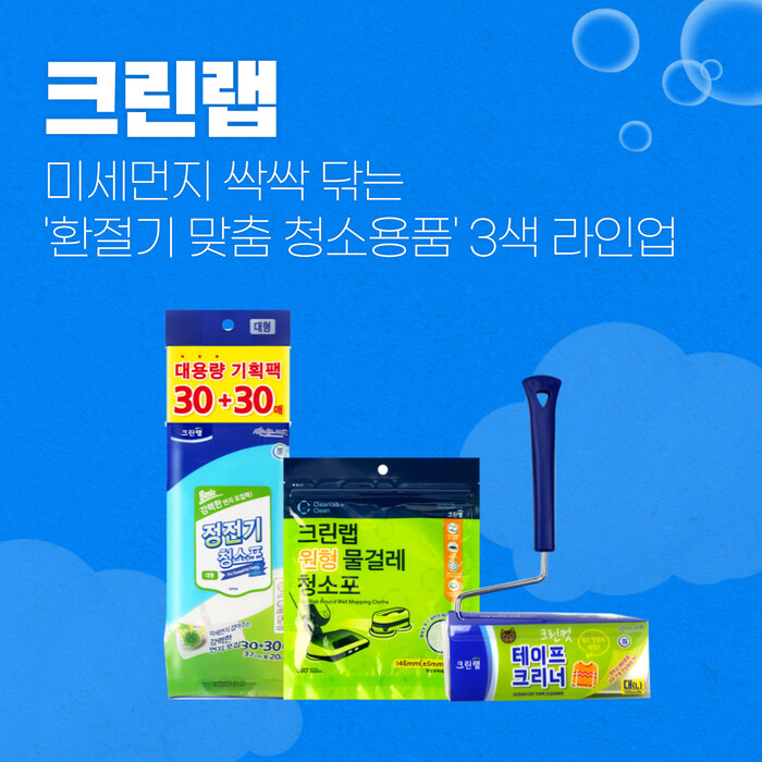 크린랩 관계자는 “봄철은 겨우내 묵은 먼지부터 미세먼지, 황사 등 먼지 케어에 특별히 신경 써야 하는 시즌이다”라며, “먼지 제거에 특화된 ‘정전기 청소포’와 활용도 높은 ‘원형 물걸레 청소포’ 등 환절기 맞춤 청소 아이템으로 청결한 실내 환경을 유지하길 바란다”고 전했다.
