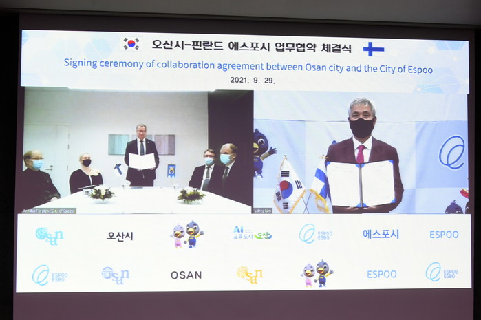 | ▲곽상욱 시장이 29일 핀란드 에스포시와 온라인 화상 대면 업무협약 체결하고 기념촬영을 하고 있다. 오산시 제공 |