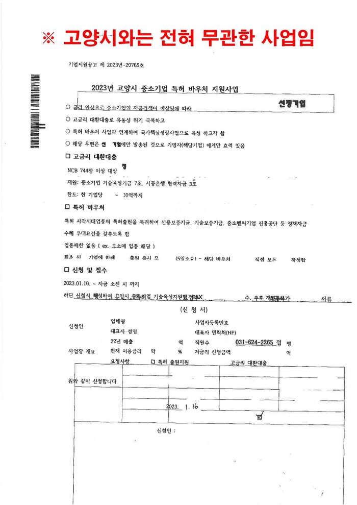고양시 관계자는 “출처가 불분명한 문서에는 절대 응하지 않아야 하며, 각종 기업지원시책은 고양시청 홈페이지 공고 란에서 확인 할 수 있으니 비슷한 문서를 수신 할 경우 고양시청 홈페이지 및 관련 부서로 사실 여부를 확인해 주시기 바란다”고 요청했다.
