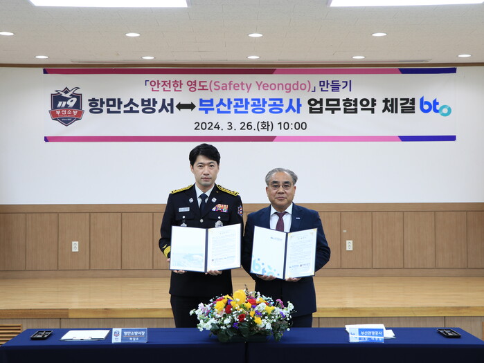 [로컬세계 부산=맹화찬 기자]부산 항만소방서는 최근 영도지역 관광자원 증가로 방문객이 늘어나는 추세에 따라, 26일 부산관광공사(사장 이정실)와 영도 관광객의 안전사고 방지 및 안전한 관광환경 조성을 위한 업무협약(MOU)을 체결했다고 밝혔다.