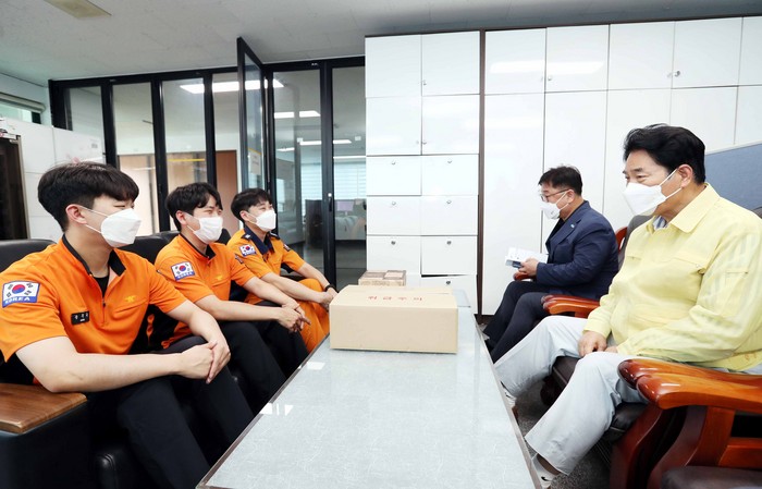 | ▲백군기 용인시장이 18일 용인소방서 구갈119 안전센터에 방문해 추석 연휴에도 업무를 위해 구슬땀을 흘리고 있는 근무자들에게 감사와 격려의 말을 전하고 있다. |